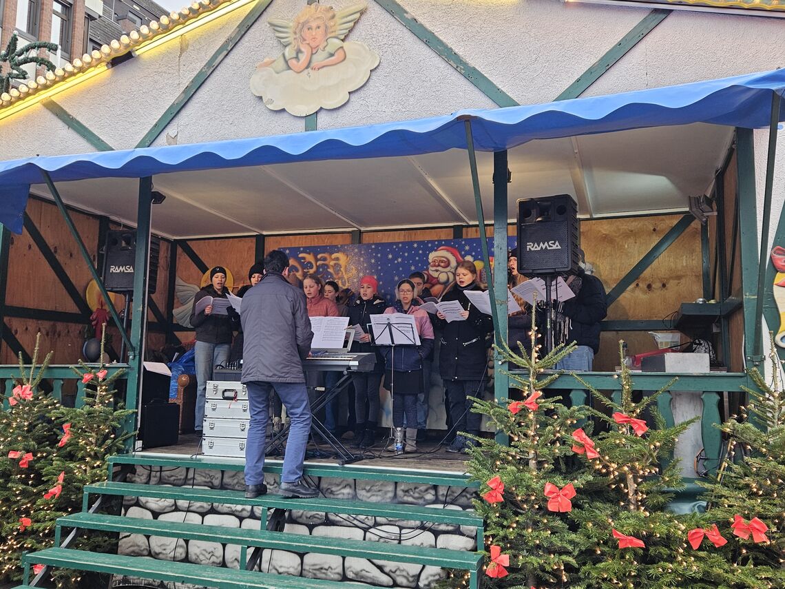Dies war schon tags zuvor der Fall, als der Chor nach der Generalprobe zum Weihnachtsmarkt wechselte und dort mit großen Teilen des Programms großen Anklang fand.